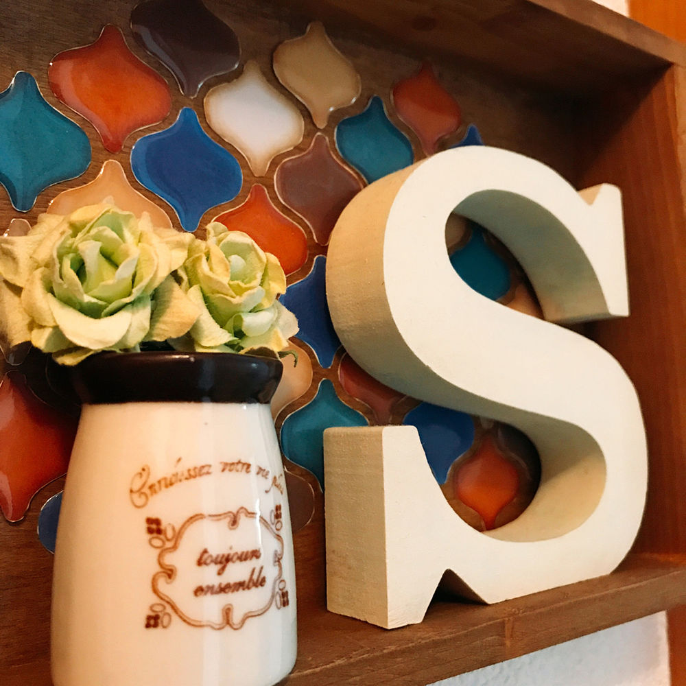 玄関の飾り棚にセリアのタイルシール貼ってみました(´∇`)σ