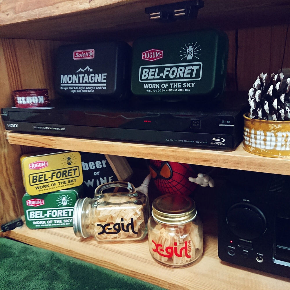 テレビ台の下。 x-girlのビン🖤 中には桧のかんなくず入れてます。