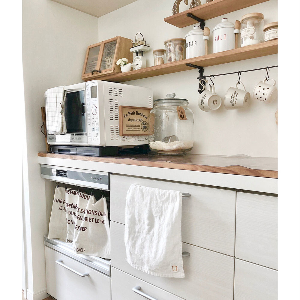 うちでは写真の通りカップボードの取手に引っ掛けて、キッチンで洗った物を拭くのに使ってます*