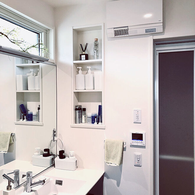 セリアで購入したブック型プラスチックケースがニッチ棚の奥行にピッタリでだいぶスッキリしました。