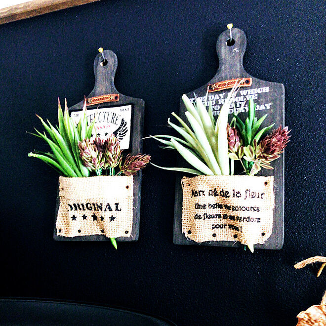 キッチンの吊り戸棚の上に飾ったカッティングボードの壁掛けリメイク。