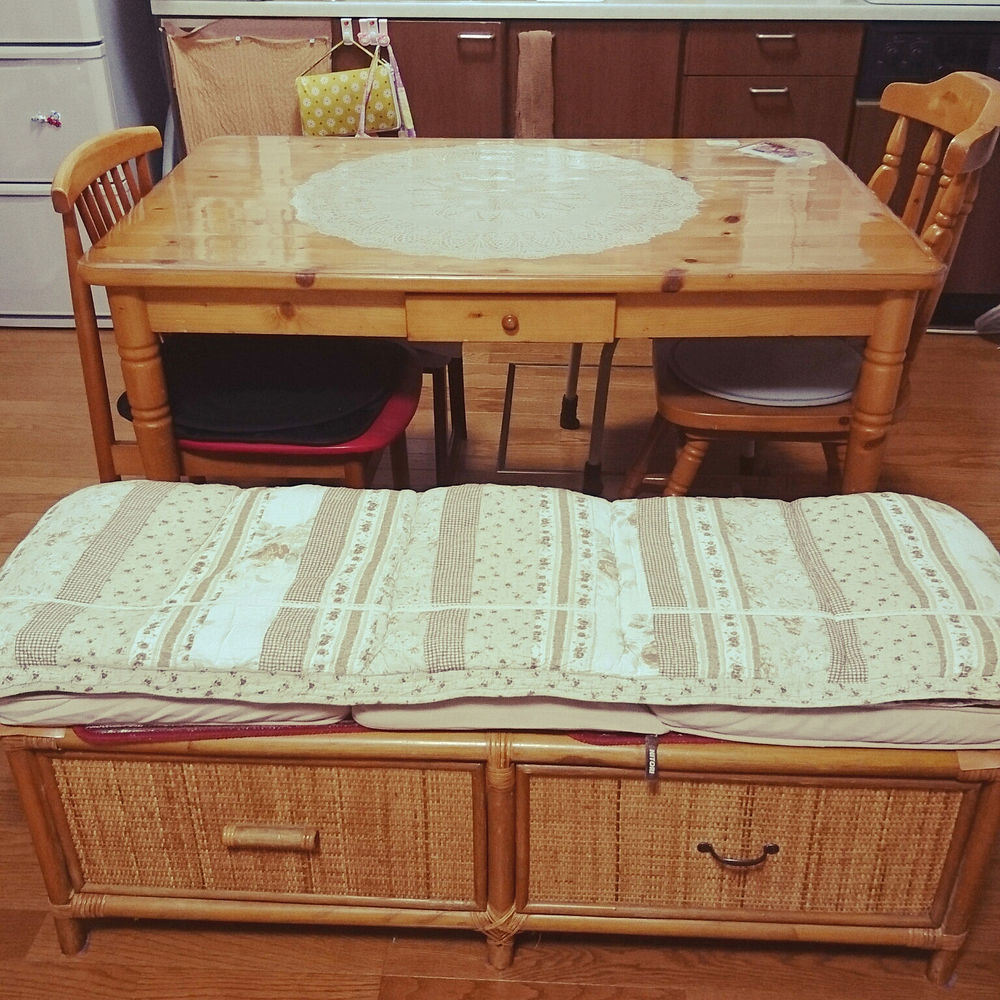 手前の籐の長椅子はもともと背もたれと付のラブチェストでしたが、購入して31年目におもいきって主人にきってもらい、今まで隅っこにあった椅子がリビングの真ん中に…