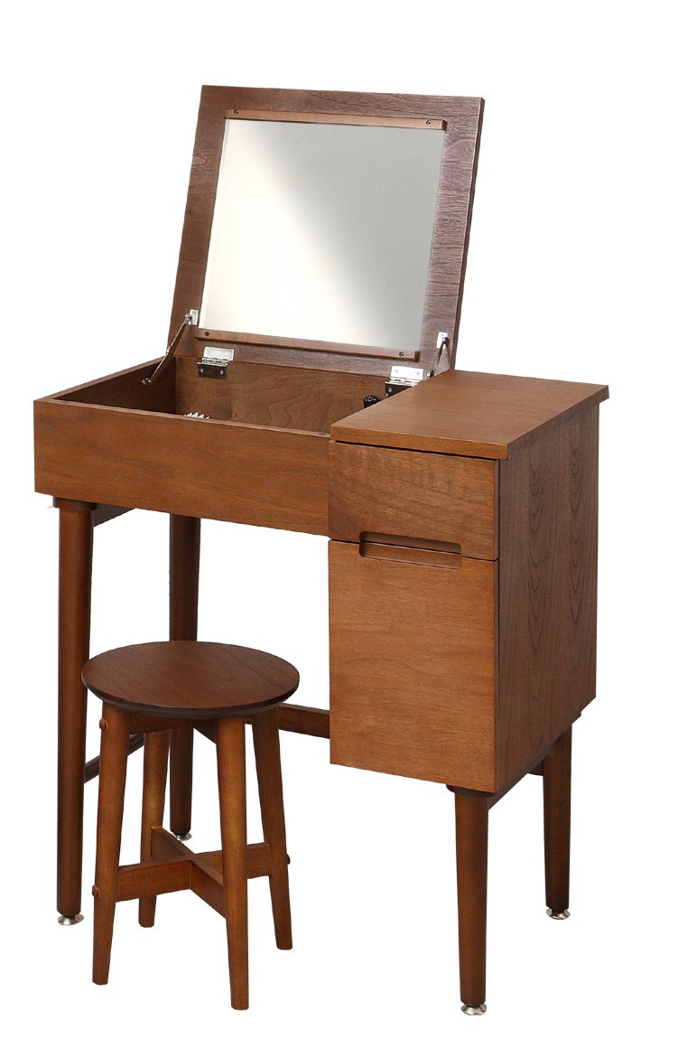天然木タモを使用した、とっても機能的なビンテージ風ドレッサーです。鏡は角度を4段階調節することができる上、天板を下ろすとデスクとしても使えます。引き出しは3つあり、メイクに必要な道具がすべて収納できるのも人気の秘密です。丸いチェアがセットになっているのも嬉しいですね。